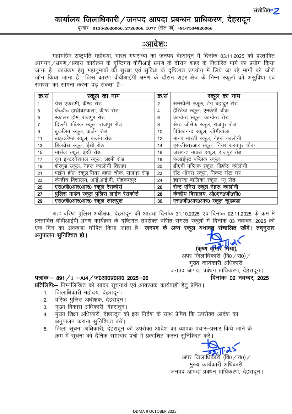 अतः वरिष्ठ पुलिस अधीक्षक, देहरादून की आख्या दिनांक 31.10.2025 एवं दिनांक 02.11.2025 के क्रम में प्रस्तावित वीवीआईपी भ्रमण कार्यक्रम के दृष्टिगत उपरोक्त वर्णित समस्त स्कूलों में दिनांक 03 नवम्बर, 2025 को एक दिन का अवकाश घोषित किया जाता है। जनपद के अन्य स्कूल यथावत् संचालित रहेंगे। तद्नुसार अनुपालन सुनिश्चित हो।