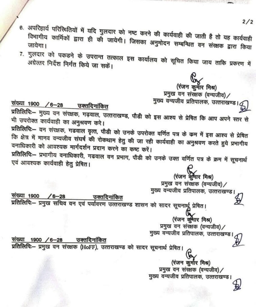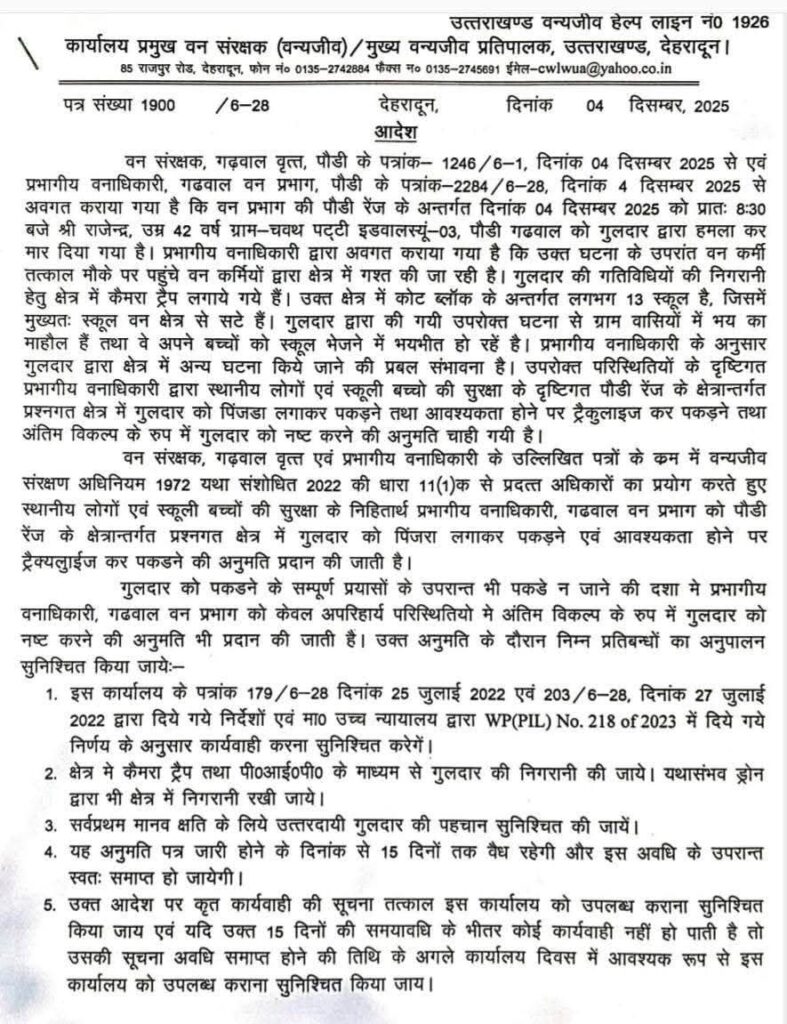 उधर गजल्ट गांव की घटना के बाद वन विभाग ने गुलदार को मारने के आदेश जारी किए हैं। प्रमुख वन्यजीव प्रतिपालक की ओर से जारी आदेश के मुताबिक गुलदार की निगरानी के लिए क्षेत्र में ट्रैप कैमरा लगाए गए हैं। लेकिन गुलदार द्वारा क्षेत्र में अन्य घटनाओं की भी प्रबल संभावना हैं। इसे देखते हुए गुलदार को पिंजरा लगाकर पकड़ने व ट्रेंकुलाइज करने और अंतिम विकल्प के रूप में गुलदार को नष्ट करने की अनुमति दी जाती है। उधर पौड़ी डीएम स्वाति भदौरिया का कहना है कि क्षेत्र में दो शूटर तैनात किए जा रहे हैं। जो गुलदार को नष्ट करने मे मदद करेंगे।